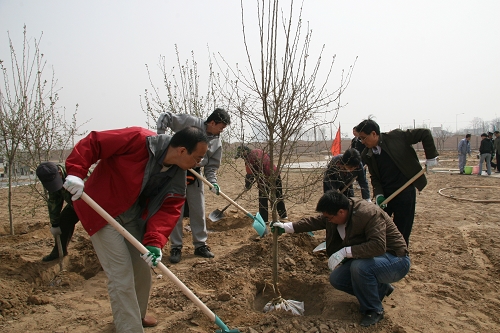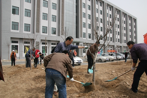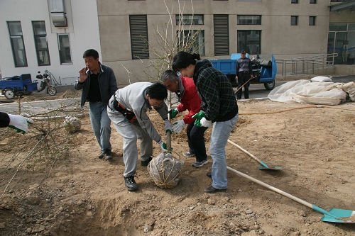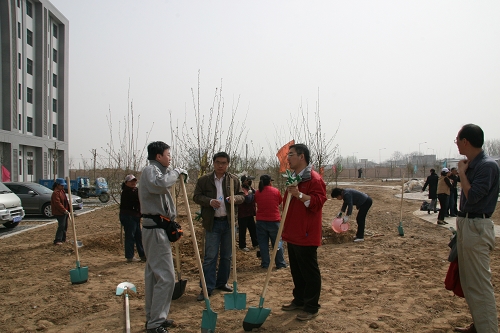 科研和管理骨干们,三五成群,在舒适的微风中,挥汗如雨,在近三个小时中合力种下了63颗树苗,看着树苗上已经不甘寂寞冒出来的嫩绿小芽,想来过几周再来看时已经是一片新绿了吧。嫩黄的迎春,展着新叶的小草、探出头来的树叶,廊坊科研中心处处显示出勃勃的生机!