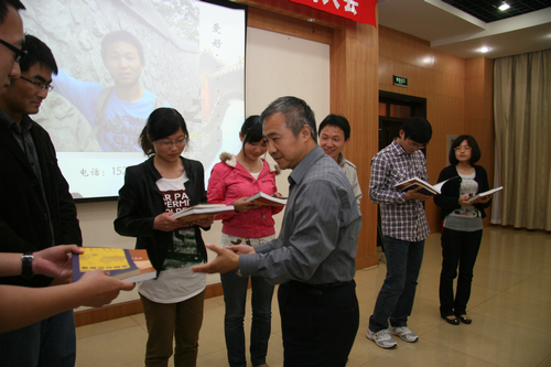竞选结束后各位评委与竞选人合影留念。此次竞聘活动中,还成立了研究所第三届政务信息与宣传研究生工作小组,参加竞聘的6名竞选人都成为该小组成员。张平书记为小组成员赠送了业务书籍。