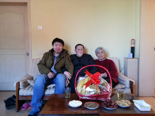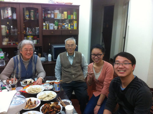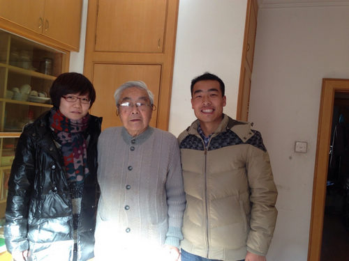 帅大平、卞凤娇和宋维健小组前去拜访葛满初和齐宗敏老师。在两位老师的盛情邀请之下,志愿者们留下来一起包饺子过节。由于三个人都不会包饺子,所以正好借机学习一下。在接下来的过程中,志愿者和老师分工合作,齐老师负责揪面团,宋维健负责擀面皮,葛老师、帅大平和卞凤娇负责包饺子。卞凤娇上手很快,得到了两位老师的表扬;帅大平包的饺子最搞怪,惹得大家发笑,他自己看了也偷着乐。在笑声中,几十个饺子很快就包好了。饺子上桌后,大家以饺子代酒干杯,庆祝新年。饭后,志愿者们接着陪两位老师聊天。聊天中得知他们的独生女儿在美国生活,一年只能回来陪他们几天,但尽管生活孤单,他们并不后悔当年劝女儿出国留学,因为女儿在那边过得很幸福。这种父母对子女永不消逝的爱让大家感动,衷心希望老人和全天下的父母晚年幸福。