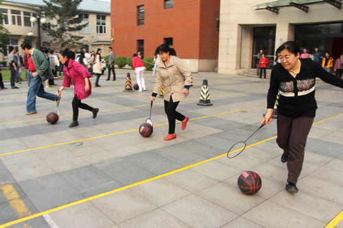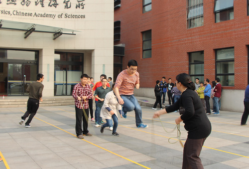 考虑到全所师生的年龄分布层次,研究所工会为本次趣味运动会设置了多项竞赛项目,既有跳绳、踢毽子两个单人项目,也有螃蟹赛跑、两人三足、赶小猪接力三个二人合作项目,还有需要团队合作的集体跳绳、“同舟共济”团体项目,共吸引了七个实验室及管理支撑部门共计一百多名职工及学生共同参与。首先进行的是螃蟹赛跑项目,两人合作,背对夹球,考验的是两人合作的协调性与默契程度,比赛过程中时而有篮球落地,重返起跑线,令参赛者捧腹,也有部分小组神速通关,令人拍手叫好称快。最有趣的还属两人三足项目,一男一女合作比赛通关,合作默契的节奏步伐一致、回转较快,而合作生疏的则步履维艰,系腿红丝带拧成了麻花,令人忍俊不禁。专为四十岁以上老师设立的“赶小猪接力”比赛中,老师们表现出的专心致志丝毫不输于刚年逾二十的年轻学生们,令年轻学生们自叹不如,感慨非如此精气神怎可达今日让人艳羡的科研成就。
