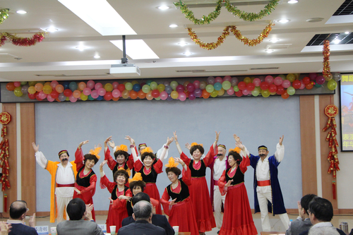 随后,全体离退休职工观看了团拜演出。一开场,2014年新成立的离退休快乐健身队一身青衣亮相登场,飘逸舒展的太极功夫扇表演就赢得了满堂喝彩;力学所离退休金色年华舞蹈队友情带来了热烈欢畅的新疆舞《达坂城的姑娘》,这支平均年龄75岁的舞蹈队跳出了老同志们的精神风貌;研究生会带来的独唱《飘雪》温柔委婉;快乐健身队的合唱《红军不怕远征难》豪迈高昂;贾建国老师的独唱《时间都去哪了》质朴感人;研究生爱心相连志愿者协会带来的合唱《相亲相爱的一家人》温暖人心;快乐健身队和力学所欢乐年华舞蹈队共同演出的大型舞蹈《万泉河水》大气磅礴。整场演出中,老同志们欢声笑语不断,感受到了节日的欢乐和喜悦。