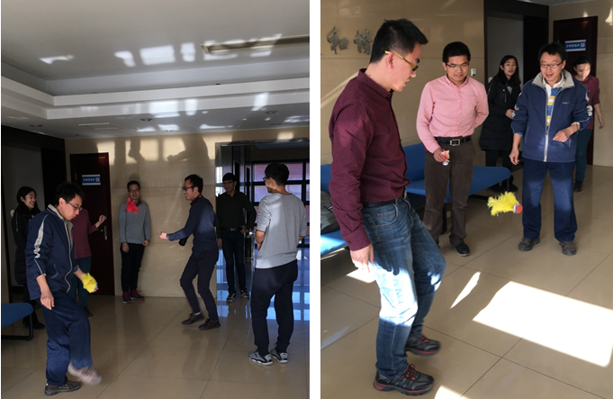午饭过后,一声“踢毽子喽”吸引来办公室里一个个懒洋洋的身影,无需专门的场地,无需专业的技术,抬抬腿、摆摆胳膊、扭扭腰,毽子就轻轻地飞舞在大家的脚尖,小时候踢毽子的童子功在此时就可见一斑。大家边踢边讨论,纷纷表示现在由于工作和生活习惯,长期坐在电脑前,腿脚真不如之前灵活了,以后真应该多动动。本来想以比赛形式组织的活动,在大家的欢声笑语中变成了一场舒经活络、欢笑开怀的午间小party。