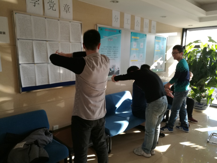 12月27日中午,“办公室微运动”活动紧随而至。大家常年在办公室专注科研,无暇顾及自己的身体健康,微运动则为大家提供了办公桌前活动身体的好方法。分工会为大家精心挑选了一套“办公室微运动”,并制作成海报张贴在休息厅里,大家一起对照海报学习,抬臂、扭腰、扩胸、伸腿,锻炼动作既简单、又能有效拉伸筋骨,帮助大家消除疲劳、舒缓身心。