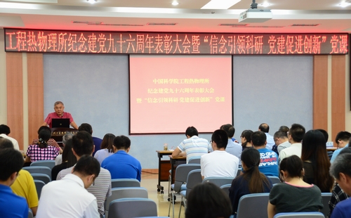 6月29日上午,工程热物理研究所举行纪念建党九十六周年表彰大会暨“信念引领科研 党建促进创新”专题党课,研究所所领导、党委委员、纪委委员和全体党员近300人参加会议。会议在雄壮的国歌声中开幕,会上表彰了先进党支部、优秀共产党员及“五四之星”获得者,循环流化床实验室党支部书记高鸣、轻型动力实验室党支部书记龚建波作党课报告,会议由赵汐潮主持。