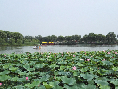我们乘船行进在白洋淀上,欣赏着白洋淀秀美的自然风光。碧水蓝天、苇绿荷红,水道两边是密密麻麻的芦苇。盛夏时节,每根芦苇从秆到叶都是鲜绿的,绿得闪闪发亮,在风中摇摆,偶有野生的水鸟飞过……好一幅美丽的北方水乡画卷。船将我们送到了荷花大观园,大观园里荷花盛开,红白相间,层层叠叠的荷花一眼望不到边,是“接天莲叶无穷碧,映日荷花别样红”美景的现实写照。随后,我们参观了著名革命作家孙犁纪念馆和抗日战争纪念馆,了解了白洋淀光荣的革命传统。抗战时期,白洋淀人民成立了著名的水上游击队“雁翎队”,利用河湖港叉开展游击战争,在芦苇迷宫和荷花荡中与日本侵略军捉迷藏,经常将侵略军打得焦头烂额,由此也产生了孙犁创作的《白洋淀纪事》,被文艺界视之为“荷花淀派”的主要代表作。
