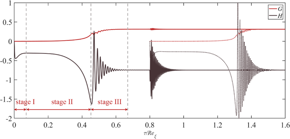 采用全隐中心差分时间推进格式求解该主控方程,结果表明:过渡态工况下,盘腔流场的响应过程持续时间已不可忽略,瞬态效应对流动结构与参数演化具有实质影响。进一步地从动态演化过程关键参数的时空分布规律入手,揭示了过渡态盘腔演化表现出显著的非线性与强时变特征,边界层发展及腔内物理参数传递过程可概括为“粘性剪切-粘性扩散-核心参数匹配”三个关键主导阶段(图2)。