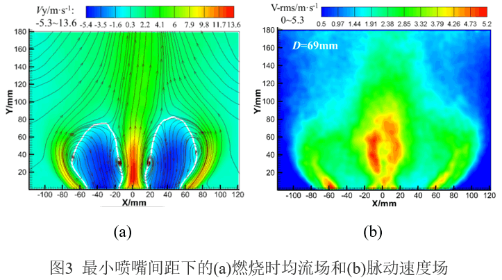 研究人员发现,确保传焰成功的最大喷嘴距离随着初始点火燃料当量比的提高而变大,同时喷嘴间的火焰传播过程大概分为四个阶段:相邻侧核心小火团的出现、跨越喷嘴向另一侧传播、火焰根部的建立与强化以及向下游传播并充分发展。传焰动态过程如图1所示。另外,还有一个重要发现:传焰成功所允许的最大喷嘴距离要小于单喷嘴的平均火焰直径,表明联焰时着火喷嘴的火焰前缘不仅接触到相邻未燃喷嘴的可燃混合物边界,而且已经插入到其内部,形成了一个具有足够能量的点火源,由此表明旋流射流间的相互作用造成燃料混合、对流传热和自由基掺混等效果,这对火焰传播起促进作用。随后进行了不同喷嘴间距下燃烧室熄火边界的测量,发现随着喷嘴间距变小,熄火当量比先变小后变大,如图2所示。这可能是因为喷嘴间距变小将导致喷嘴间燃料浓度和火焰温度的升高,这种效果会促进火焰稳定,但随着两个喷嘴进一步靠近,射流融合、流速增大和火焰面局部拉伸的效果变得明显,这将对火焰稳定造成不利影响,两种效果相互竞争的结果又会使熄火当量比稍微变大。最后使用示踪粒子图像测速仪(PIV)研究了喷嘴间的流动耦合和速度脉动情况。最小喷嘴间距下的流场和脉动速度场如图3所示。发现相邻的两股射流合并,轴向峰值速度远高于自由射流速度,同时喷嘴间相互作用的区域中存在很大的速度脉动,这进一步验证了之前的分析。