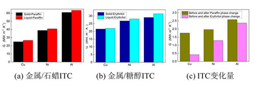 泡沫金属相变复合材料在储热(冷)系统中起着至关重要的作用,不同泡沫金属与相变材料在不同相态下的界面热导是影响蓄热(冷)系统蓄热(冷)过程的重要因素之一。团队首先采用TDTR(图1)测定了三种金属(铜、铝、镍)与两种相变材料(石蜡、赤藻糖醇)分别在固/液相态时的界面热导。实验结果(图2)表明,相同条件下金属/石蜡的界面热导大于金属/赤藻糖醇,这是由于石蜡分子尺寸小于赤藻糖醇,使得石蜡和金属的润湿性更好。同时实验表明与固态相比,液态两种相变材料与各种金属的界面热导都更大。与固态相比,液态pcm与基体金属的相互作用更强,润湿性更好,这导致液态粘附层的ITCs受基体材料的影响更大。由于金属/ pcm的润湿性不同,对于同一种金属材料,相变前后金属/石蜡界面热导的变化比金属/赤藓醇界面热导的变化更大。另外无论是石蜡还是赤藻糖醇,无论是固相还是液相,相变材料的界面热导结果都保持了铜<镍<铝的相同趋势。