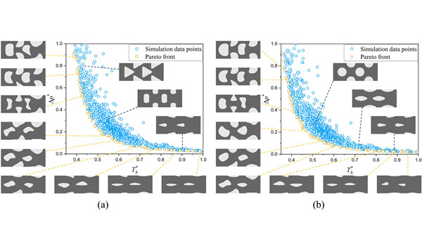 新技术实验室于晨阳博士、杨明副研究员、张航研究员等首先对大量不同翅片数量和尺寸的椭圆形针翅微通道进行了数值模拟。随机森林分类器做特征重要性排序结果显示,进口流速和翅片宽度对性能参数影响较大,而翅片长度、列数和行数对性能参数影响较小。之后建立了神经网络以拟合尺寸参数和性能参数间的关系,并用其对大量未知工况进行了预测,如图1。对以加热面温度和通道压降为目标的帕累托前沿上的参数分布进行分析可知,要降低驱动泵的功率时,翅片应该在主流方向上更长,单列翅片个数应该更少,要降低加热面温度时则相反,如图2。结合数值模拟和神经网络预测,提出了一种在较大流速范围内具有最高综合热工水力性能的椭圆针翅微通道,其综合性能指标相比方形、菱形、三角形等传统形状翅片至少增加9.1%。该研究第一作者为博士生于晨阳和硕士生朱旭,通讯作者为杨明副研究员和张航研究员,成果发表在《International Journal of Heat and Mass Transfer》,入选ESI工程领域 top 1% 论文。