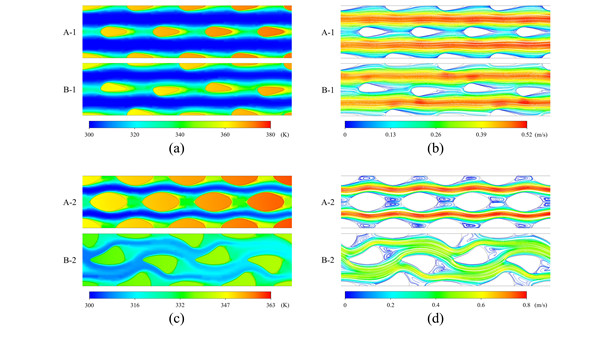 为了扩大优化空间,研究者还进行了大量不规则针翅微通道的数值模拟,可调尺寸参数为各翅片6个方向的半径,如图3。为了提高优化效率,建立了神经网络训练-遗传算法寻优循环进行的方法。结果表明,根据翅片的形状,帕累托前沿可分为三部分:在低压段,翅片呈细长型以减少流动阻力;在中压段,翅片间形成斜向的流道,以延长流体与翅片之间的接触时间;在高压段,翅片呈纺锤形,以最大化流道的长度并同时避免阻力急剧增加,如图4。由优化结果提炼出了强化传热的翅片布置方式:在一列中将不对称的翅片交替取向排列。其强化传热机理是非对称翅片使得额外的流束穿梭其中,有更多流体参与换热,提高了出口处流体温度的均匀性。根据该规律,在三个区段分别给出了优化的多翅片通道,并与传统通道进行了对比,如图5。其中,中压优化通道性能较椭圆形翅片通道有大幅提升,在通道压降不变时,加热面温升降低了24.4%。此外,还基于此结构设计了沿流动方向变物性的复合材料微通道散热器以降低加热面温度并提升温度均匀性。该研究第一作者为博士生于晨阳,所内通讯作者为杨明副研究员和张航研究员,成果发表在Advanced Composites and Hybrid Materials(影响因子23.2)。