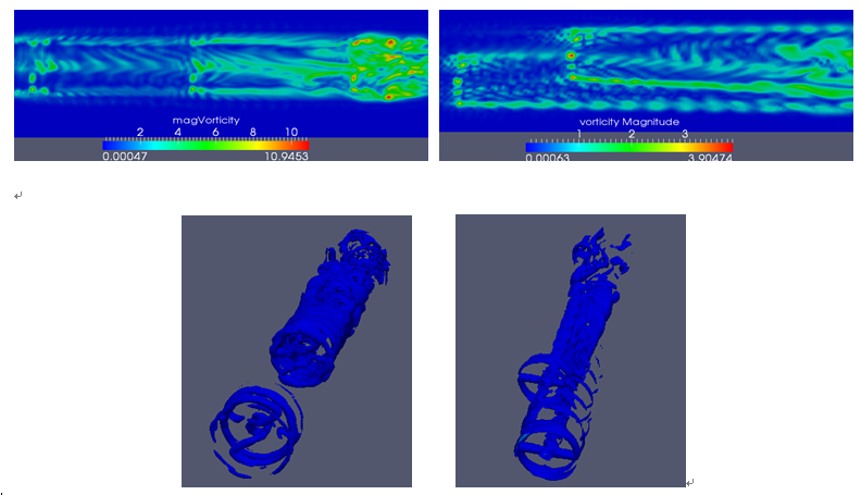 图二 改进致动面模型纵排(左)及错排(右)排布下轴向切面涡量云图分布及等值面