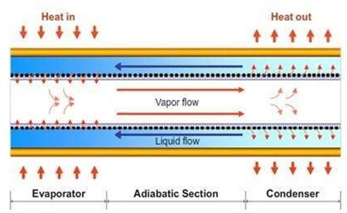 热管作为一种高效的导热原件,能够快速高效地把热能从一个地方输送到另一个地方,也就是能够把热量快速有效地在两个物体间进行传输。在电动汽车的热管理系统中,国内外很多学者也把热管这一导热原件应用到动力电池的散热中。与传统的强制对流散热系统相比,在引入热管的散热系统中,动力电池不仅能维持在正常工作的温度范围内,而且各电池单体之间也能够保持温度的均匀性,这是强制冷却散热系统所不能达到的效果。但其质量和体积过大,存在换热极限。