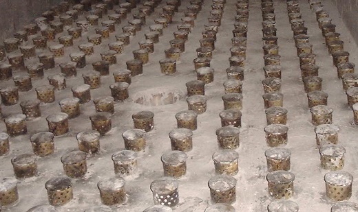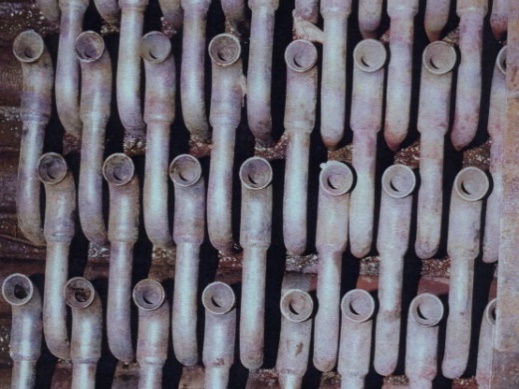 流态化就是重力与浮力作用在一大堆固体颗粒上的结果,浮力从布风板进入炉膛的风流过颗粒时对颗粒产生的曳力。为了使得供风均匀,同时要托住颗粒,在炉膛的底部要设置布风板,布风板下面接风室。布风板的基本结构是个大平板,工作条件非常苛刻。布风板的主要作用是均匀布风,使风箱中的空气从整个布风板均匀的进入炉膛,使炉膛中的颗粒均匀的流化,因此首先要均匀的布置布风板上的出风孔;同时,为了防止炉膛中的颗粒从这些出风孔落入风箱或堵塞出风孔,这些出风孔要配上风帽。早些时候,各种各样的风帽层出不穷,名称也有点搞笑:蘑菇头、猪尾巴管、T型头、扁口、柱型等等,这其中柱形风帽听上去比较中性一些。这些风帽实在不容易:既要将风室的200~300℃的预热空气均匀的导入炉膛,还要承受炉膛中850~950℃的烟熏火燎和颗粒的冲刷磨蚀;安装时可以焊接,检修时又可以方便的拆卸;既要足够坚硬,又能够承受低温与高温的双面夹击和温度的波动。感谢高温合金的研发人员,这些问题用十几年的时间逐步解决了。